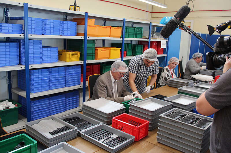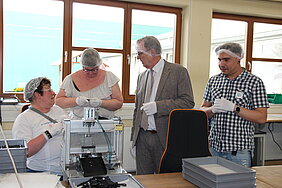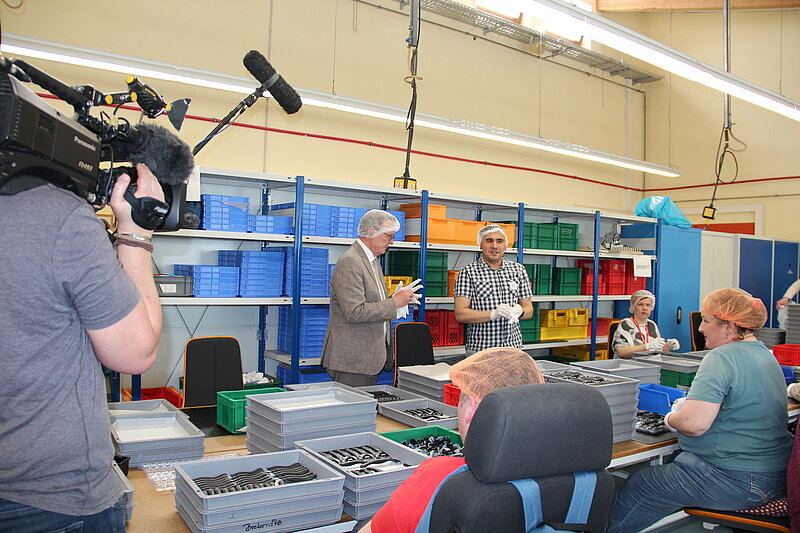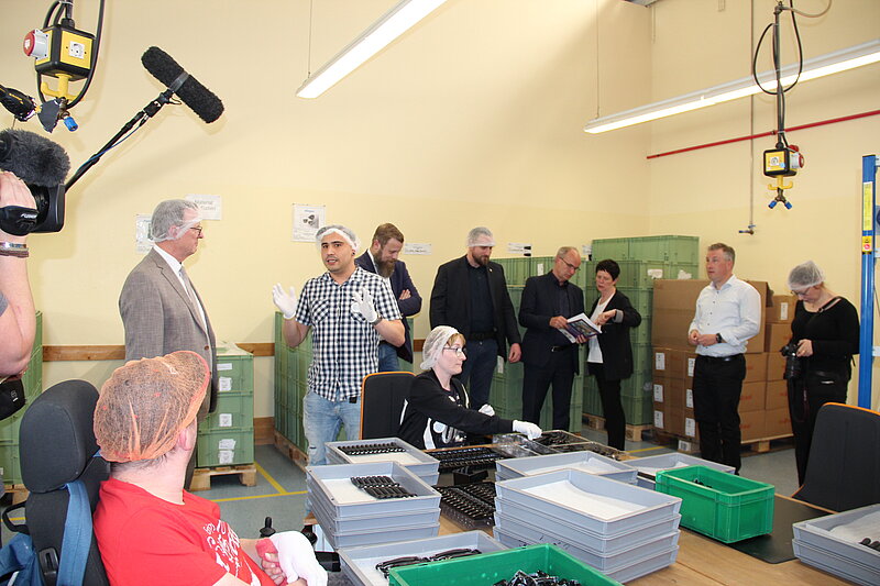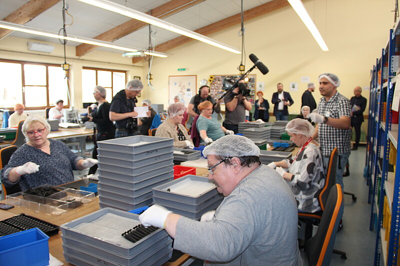 Er wurde von Dr. Klaus Scholtissek, dem Vorsitzenden der Geschäftsführung der Diakoniestiftung, und Werkstattleiter Fridtjof Kurt Kozianka begrüßt. Gemeinsam ging es an den Arbeitsplatz von Paul Knight. Von dort übernahm der junge Mann die Regie. Mit großer Freude und voller Stolz zeigte er den Montagebereich der Werkstätten, in dem Menschen mit Handicap pro Tag mehrere tausend Einwegrasierer komplettieren und diese damit für den Verkauf vorbereiten. Während der Arbeit kam man ins Plaudern. Bodo Ramelow erfuhr, wie Paul Knight sich entwickelt hat. Er kam über den Berufsbildungsbereich in Altengesees und die Hauswirtschaft in die Montagegruppe nach Saalfeld. Dort ist er überaus zufrieden und will bleiben, denn er traut sich eine Beschäftigung auf dem ersten Arbeitsmarkt nicht zu. Schafft es aber an drei Tagen pro Woche an einem Außenarbeitsplatz in einer Saalfelder Tagespflege, die Beschäftigung und Betreuung alt gewordener und hilfebedürftiger Menschen zu unterstützen. "Die Mischung macht´s, ich bin sehr, sehr zufrieden", sagte der junge Mann, während Thüringens Ministerpräsident die Montagearbeit verrichtet und zwar sehr gut, wie der Klient mehrmals anmerkte. Schnell war das Eis auch zwischen den anderen Frauen und Männern gebrochen. Eine für beide Seiten interessante, erfrischende Begegnung.