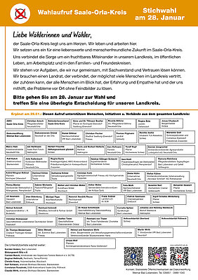 Die Wählerinnen und Wähler im Saale-Orla-Kreis sind aufgerufen, am Sonntag, 28. Januar 2024, in einer Stichwahl einen neuen Landrat zu wählen. Die Initiative Wahlaufruf-SOK, wird von vielen Personen des öffentlichen Lebens, Initiativen und Verbände im Saale-Orla-Kreis unterstützt.
